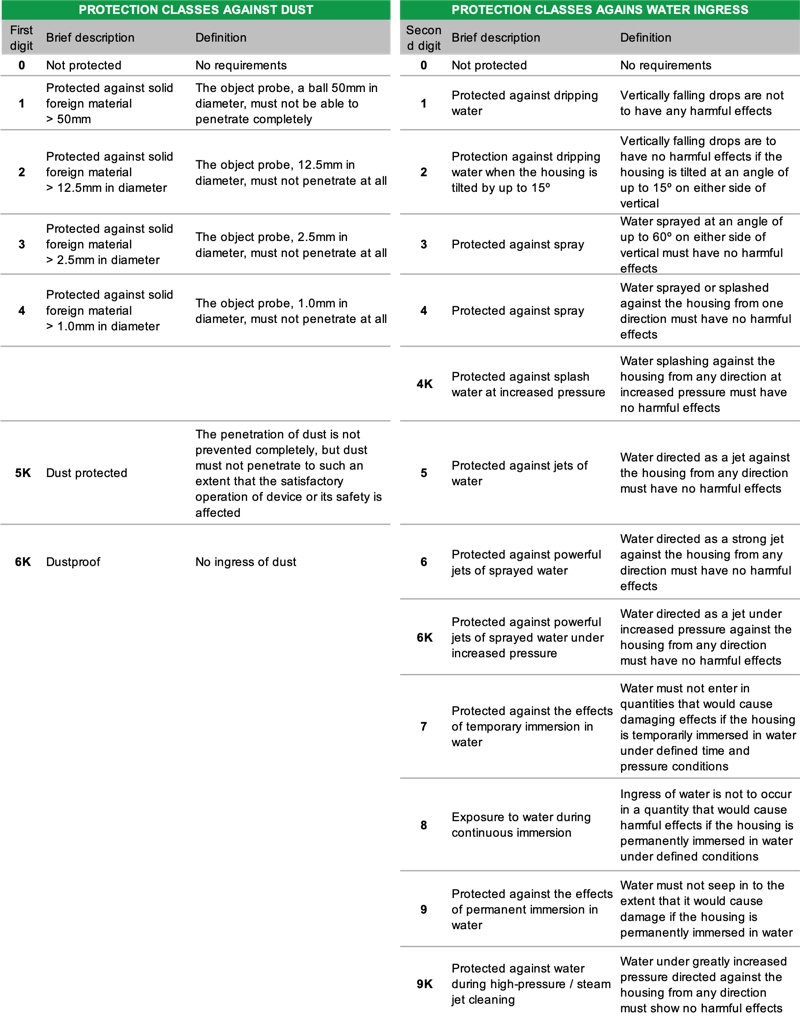 The first code number indicates degrees of protection against the ingress of foreign bodies (dust), the second code number against the ingress of moisture or penetrating water. The exact IP rating is determined by a series of standardised tests.