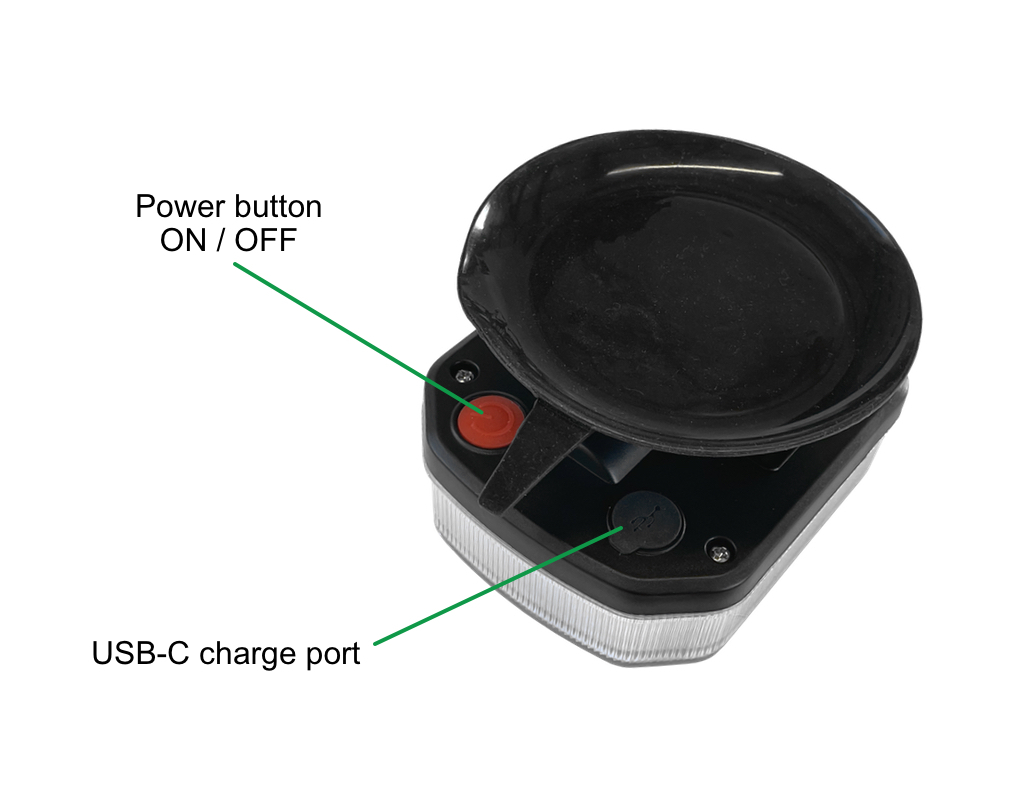 – Charging: USB-C on the back of the lamp (included USB-C cable and cigar plug charger)