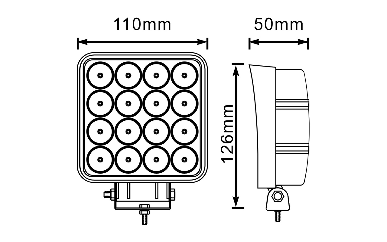 PRODUCT CODE: EWL5448110LED work light with dimensions 110x110mm and rated power of 48W, operates at 10-110V. Beam is formed by sixteen 3W LEDs with a total light intensity of 3000 lumens. With an electrical output up to 110V, it is especially suitable for forklifts.