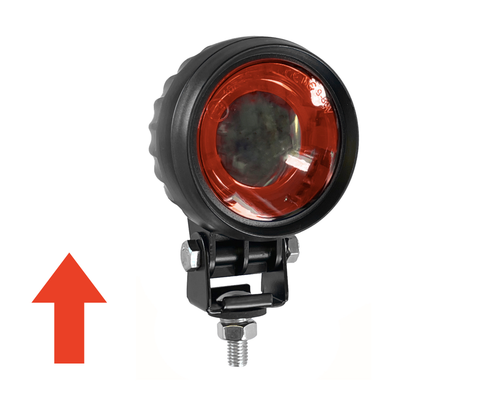 Faro lavoro (freccia rossa) LED per carrelli elevatori. Ha dimensioni ø90x80mm e funziona a tensione elettrica 12-80V con una potenza di 3x3W. Proietta una freccia rossa che indica la vicinanza e la direzione di carrello elevatore in movimento, aumentando la sicurezza nell’area del carrello elevatore.