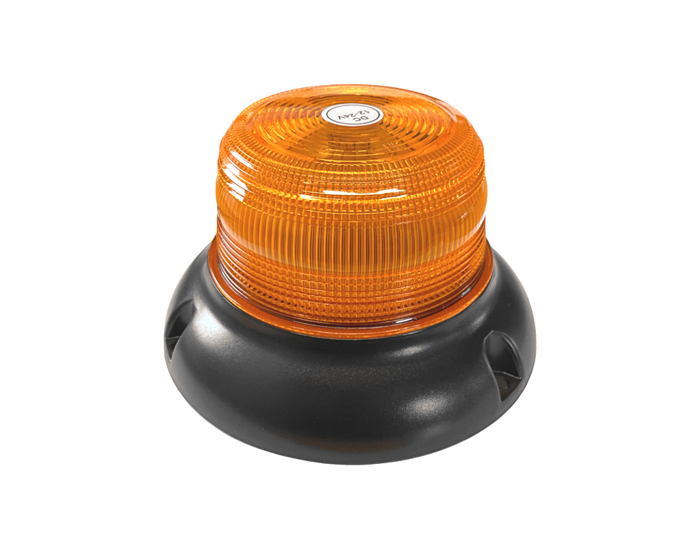 Faro lampeggiante LED arancio con diametro di 130mm (87mm vetro), funziona a tensione elettrica 12-24V con 22W di potenza. Fissaggio con viti a base piana.