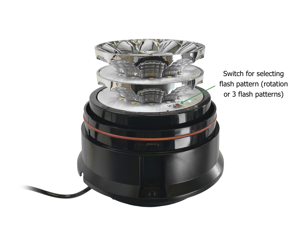 ŠIFRA: EBLM59803Svetilka strešna LED utripajoča oranžne barve s premerom 140mm in višino 170mm. Deluje na električni napetosti od 12 do 12V in bliska z nazivno močjo 24W. Na površino se namesti z magnetno in vakuumsko podlogo.