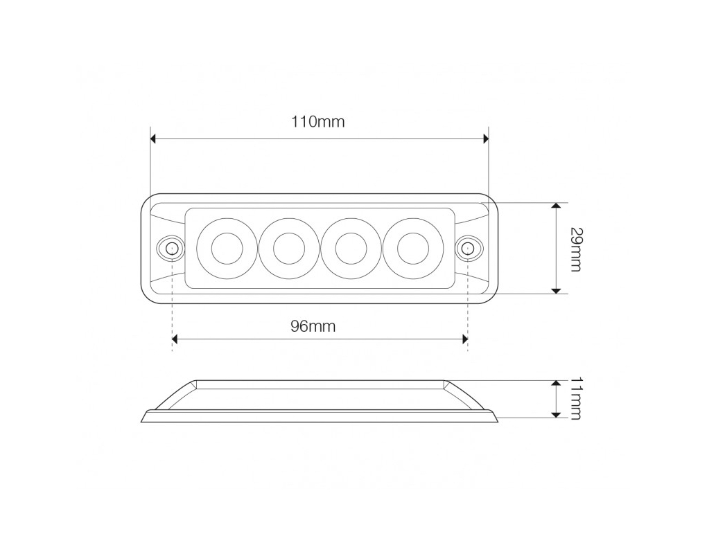 ŠIFRA: ELEO4SSSvetilka bliskajoča s štirimi oranžnimi LED diodami. Dimenzije bliskajoče svetilke so 110x29x11mm. Deluje na električni napetosti od 12 do 24V. Na površino se pritrdi z dvema vijakoma.
