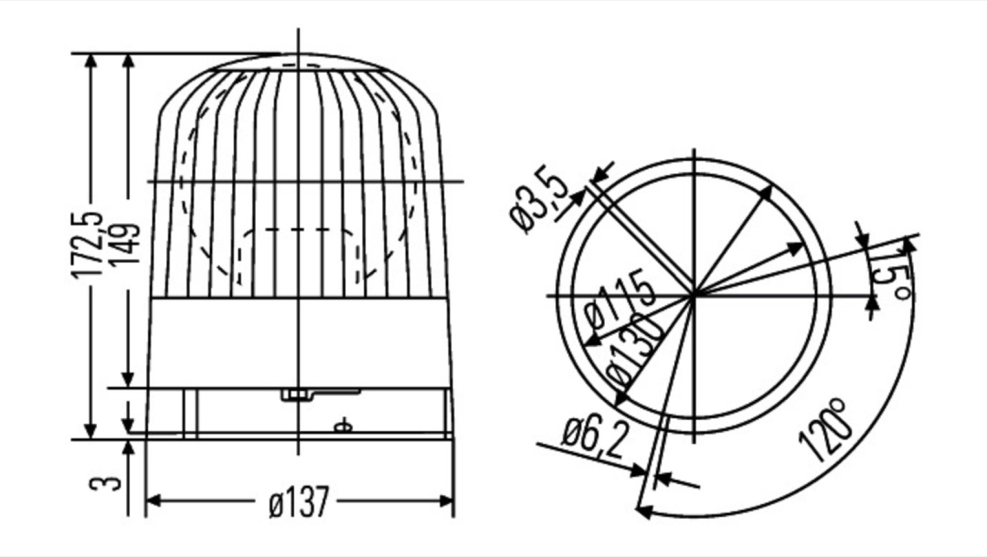Svetilka rotacijska Junior oranžna s premerom 137mm in višino 172,5mm deluje na električni napetosti 12V ali 24V.