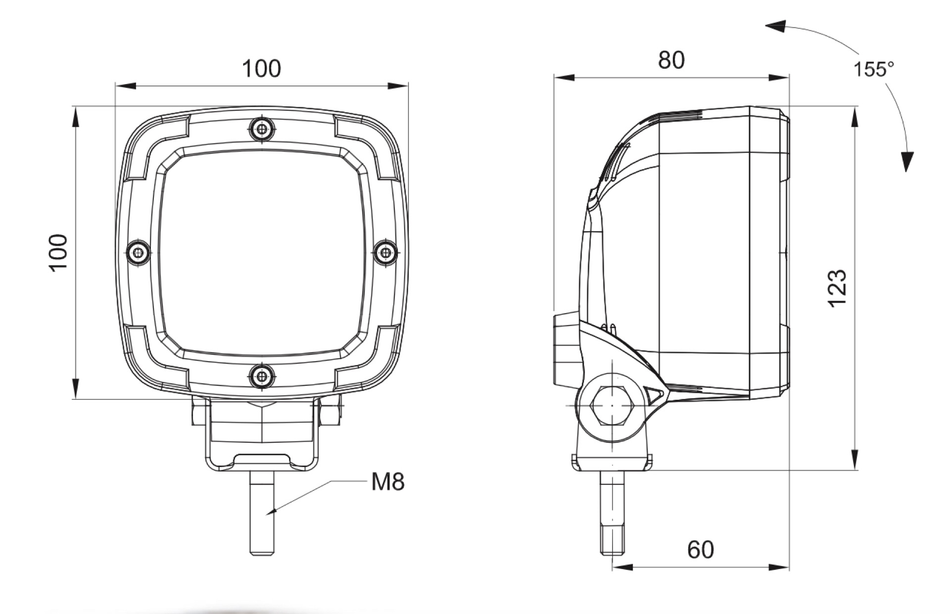 Žaromet delovni LED z dimenzijami 100x100mm in nazivno močjo 13,5W deluje na električni napetosti od 12 do 55V. Delovni žaromet sestavlja devet LED diod s skupno izmerjeno efektivno svetilnostjo 1800 Lumnov. Z električno napetostjo do 55V je posebej primeren za viličarje.