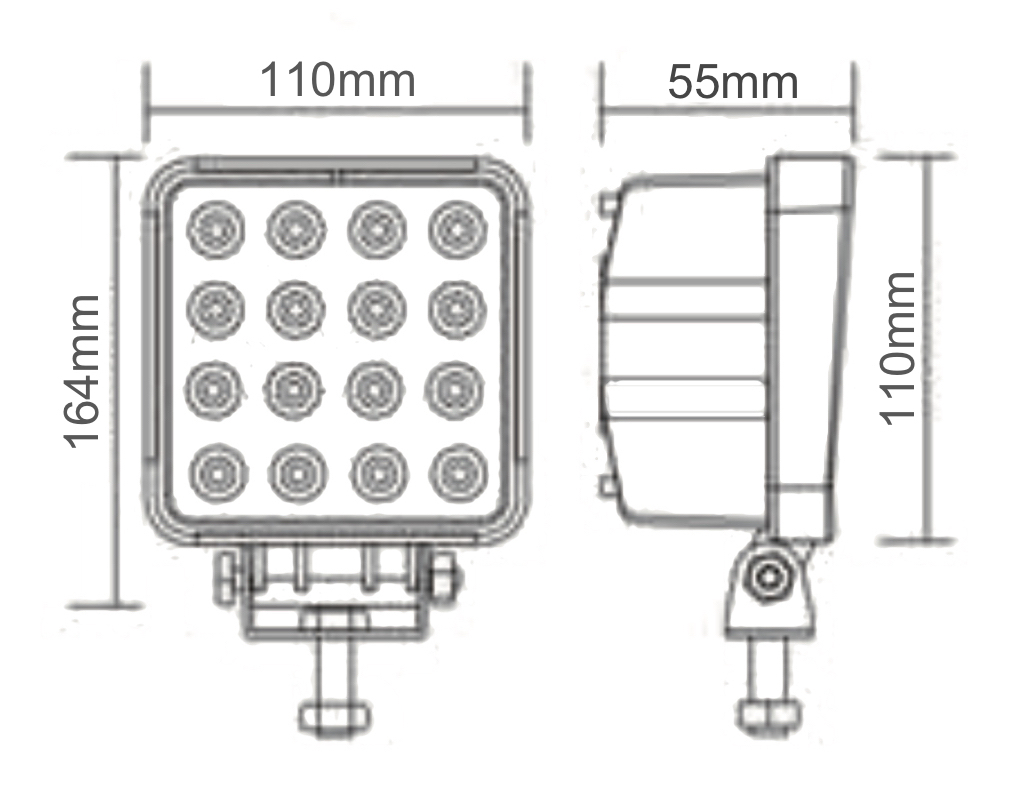 ŠIFRA: EWL48481Žaromet delovni LED z dimenzijami 110x110mm in nazivno močjo 48W deluje na električni napetosti od 10 do 30V. Delovni žaromet sestavlja šestnajst 3W LED diod s skupno izmerjeno svetilnostjo 3000Lm.