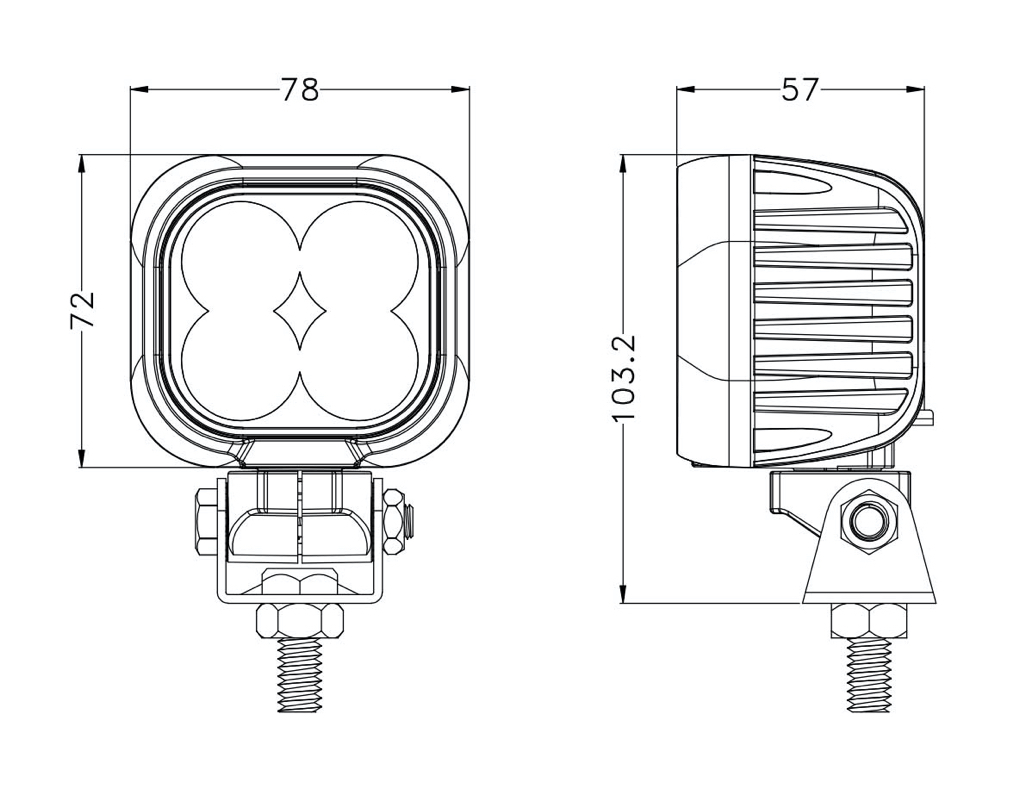 Žaromet delovni LED z dimenzijami 78x72mm in nazivno močjo 40W, deluje na električni napetosti od 9 do 32V. Delovni žaromet sestavljajo štiri 10W LED diode s skupno dejansko svetilnostjo 3200Lm. 360-stopinj obračljiv nosilec omogoča odlično usmerjanje žarometa.