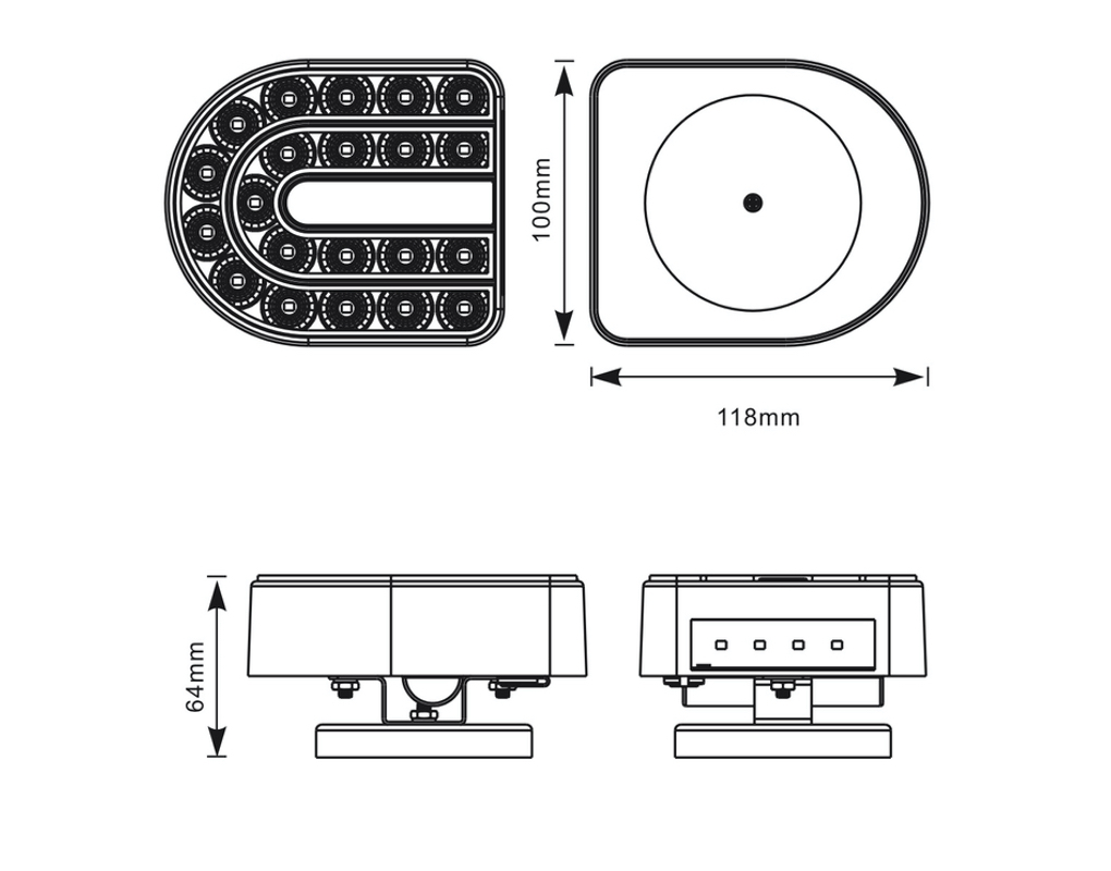 Set magnetnih zadnjih LED svetilk deluje na 12V električni napetosti. Posamezna svetilka ima dimenzije 118x100mm in ima funkcije: pozicija, stop, smerokaz, svetilka tablice ter trikotni odsevnik. Svetilki povezuje 2,5m kabel, priklopni kabel s 7-polnim vtikačem je dolžine 7,5m. Set je primeren za različne prikolice. Montaža na zadnjo stran vozila.